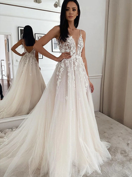 BEACH Spaghetti Strap Deep V Neck Wedding Dress